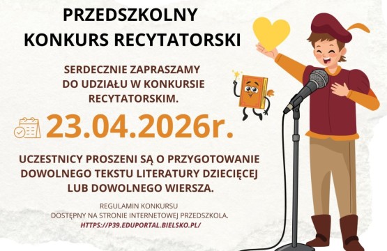 Serdecznie zapraszamy dzieci do wzięcia udziału w konkursie Recytatorskim, który odbędzie się w naszym Przed...