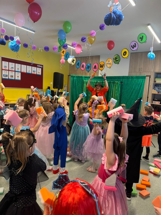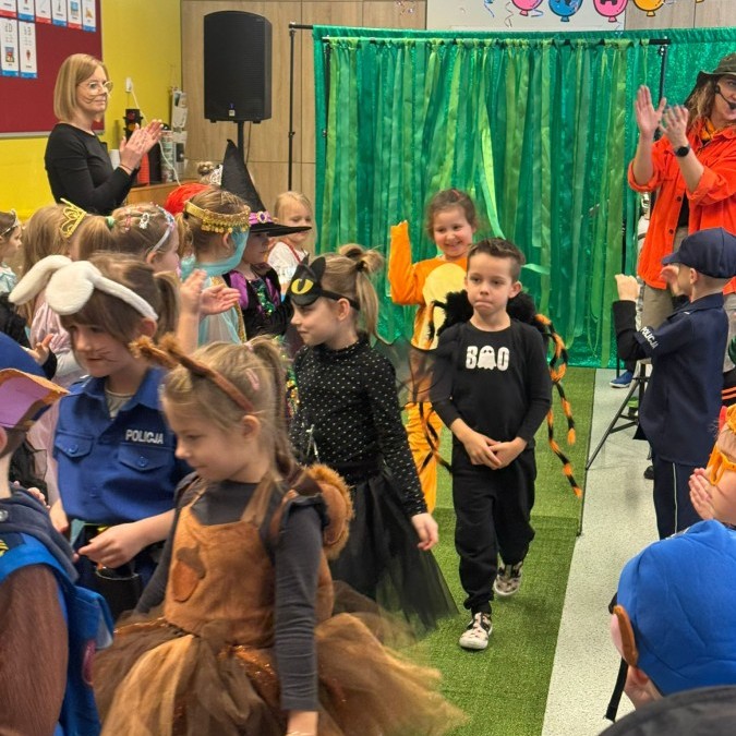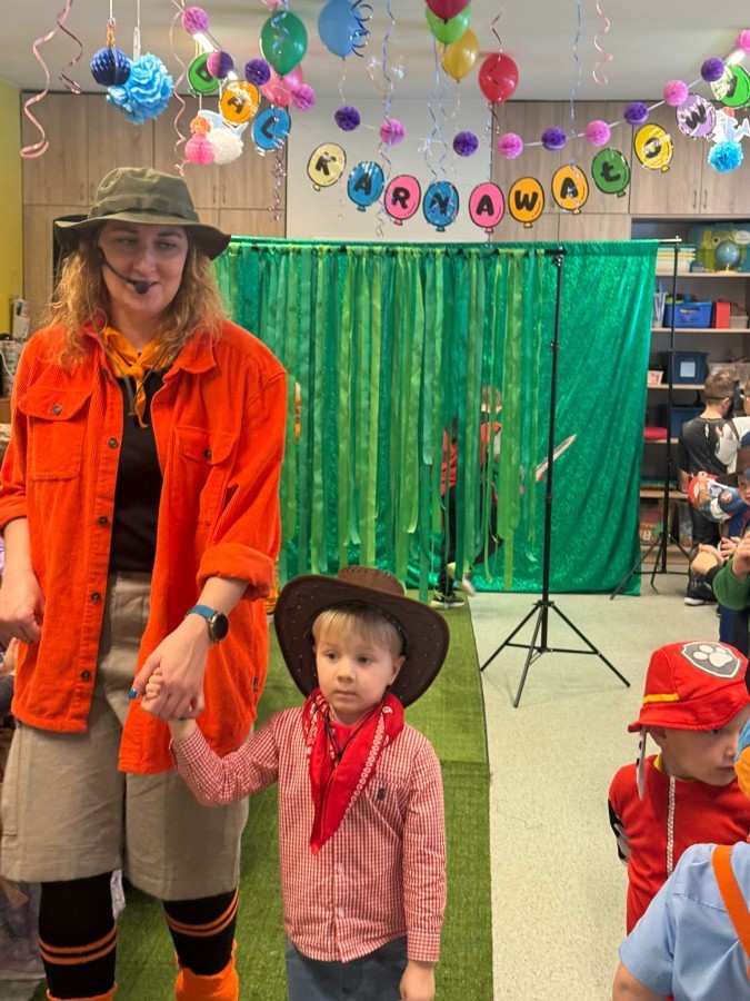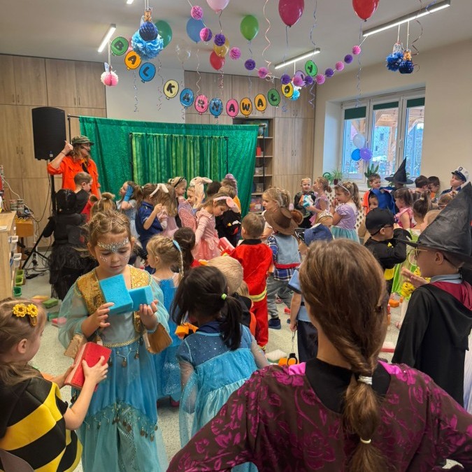 Zabawa rozpoczęła się wspólnym tańcem, po którym dzieci brały udział w licznych zabawach muzyczno‑ruchowych, konkursach oraz animacjach prowadzonych przez Panią animatorkę. Nie zabrakło korowodów, tańców w parach i zabaw integracyjnych, które sprzyjały budowaniu relacji i współpracy w grupie.