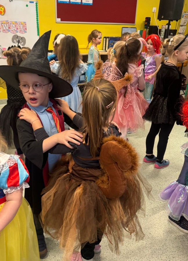 Po intensywnych tańcach dzieci odpoczywały przy słodkim poczęstunku, dzieląc się wrażeniami i podziwiając stroje kolegów i koleżanek.