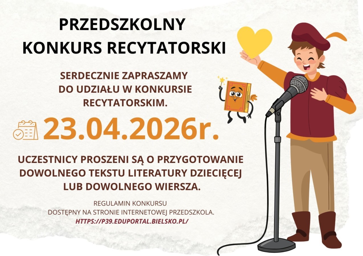 - konkurs recytatorski odbędzie się w Przedszkolu Nr 39 dnia - 23 kwietnia o godzinie 09:30
