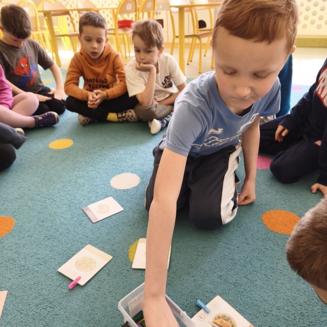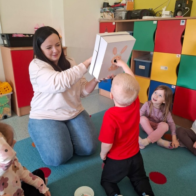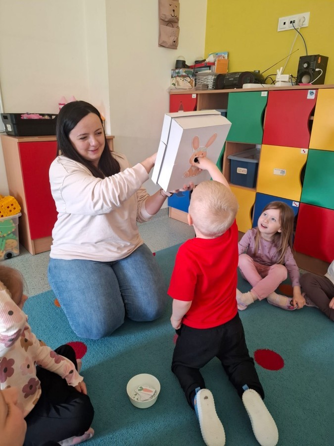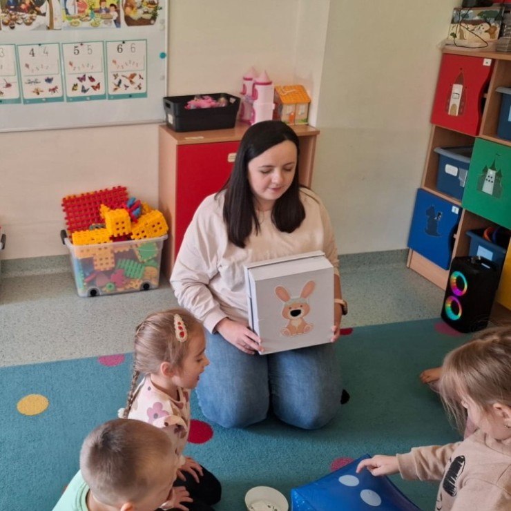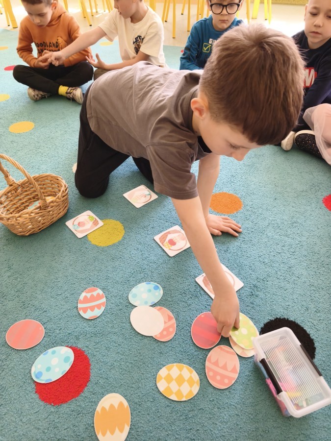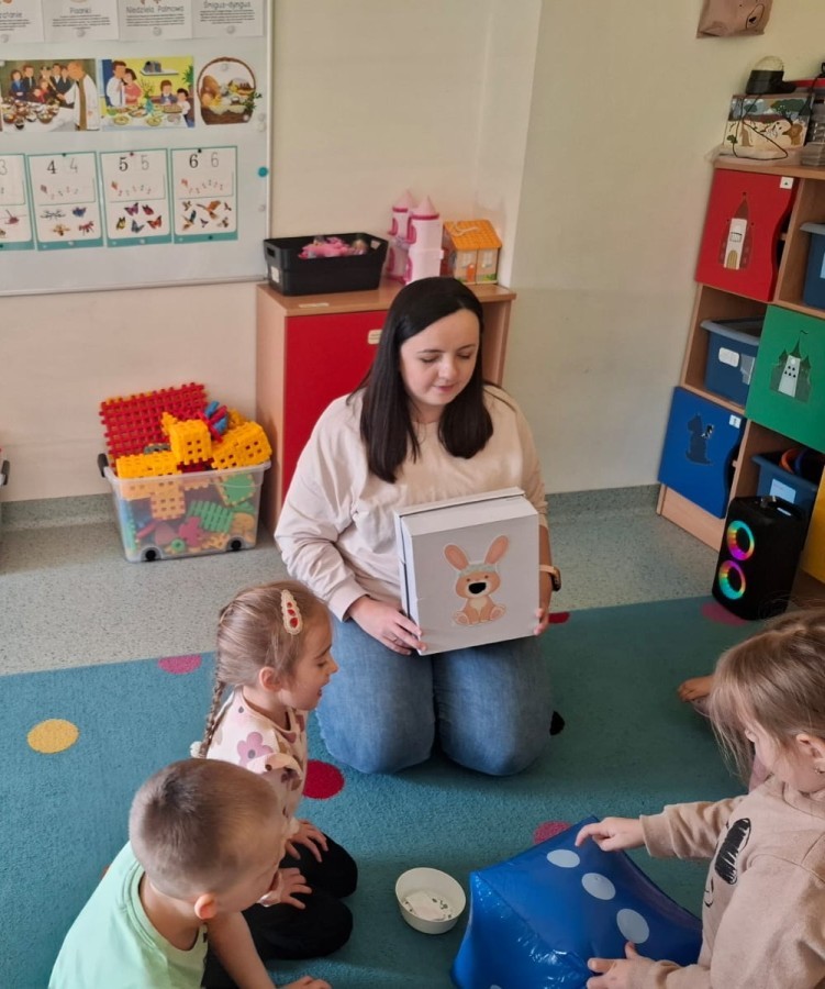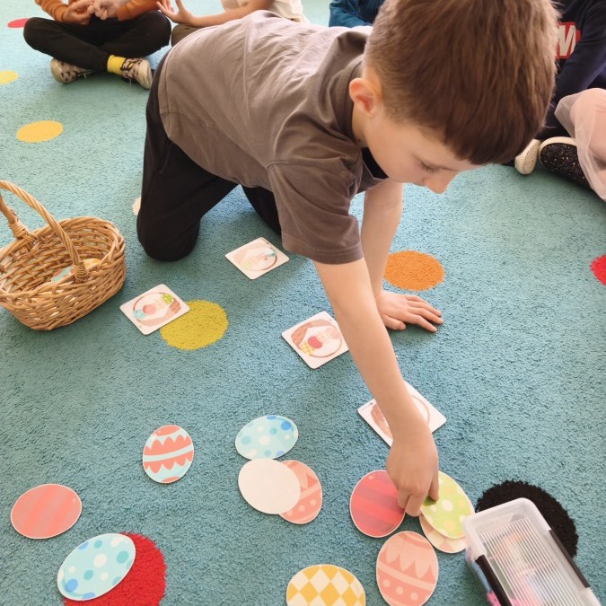 Wspólnie odkrywali艣my, sk膮d bior膮 si臋 kolorowe pisanki, dlaczego w koszyczku znajduj膮 si臋 ró偶ne symbole oraz jak膮 rol臋 w wielkanocnych opowie艣ciach odgrywa zaj膮czek. Rozmowy by艂y pe艂ne rado艣ci, ciekawych spostrze偶e艅 i dzieci臋cej wyobra藕ni.