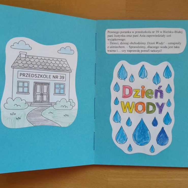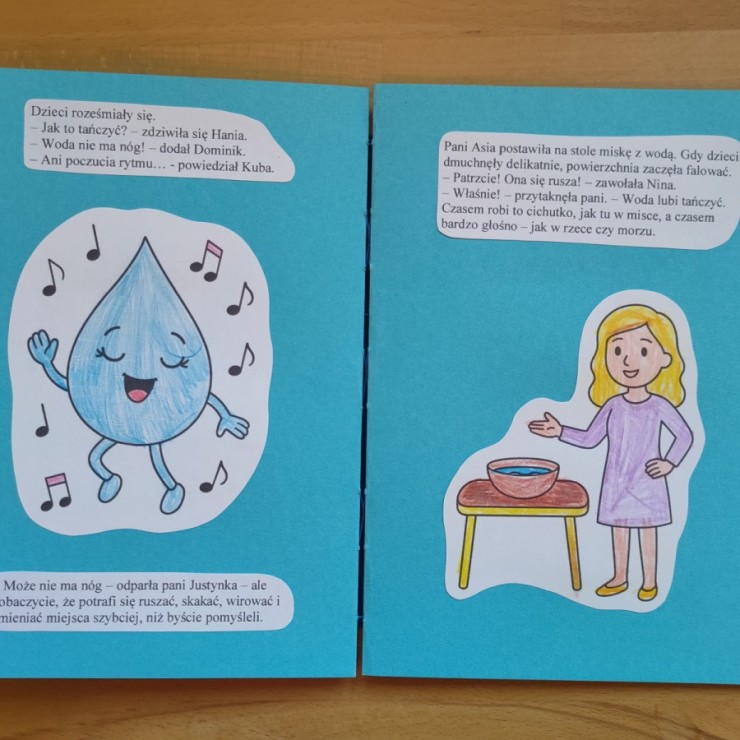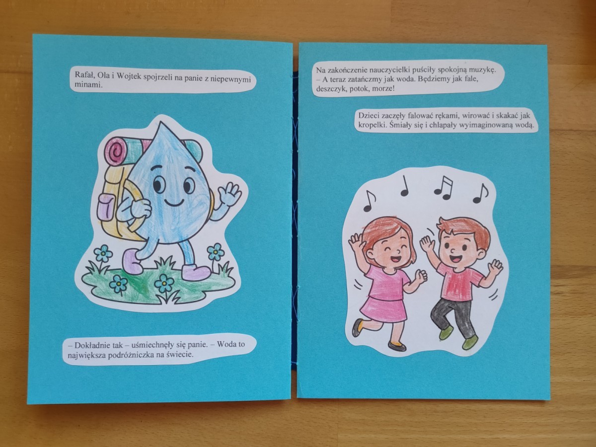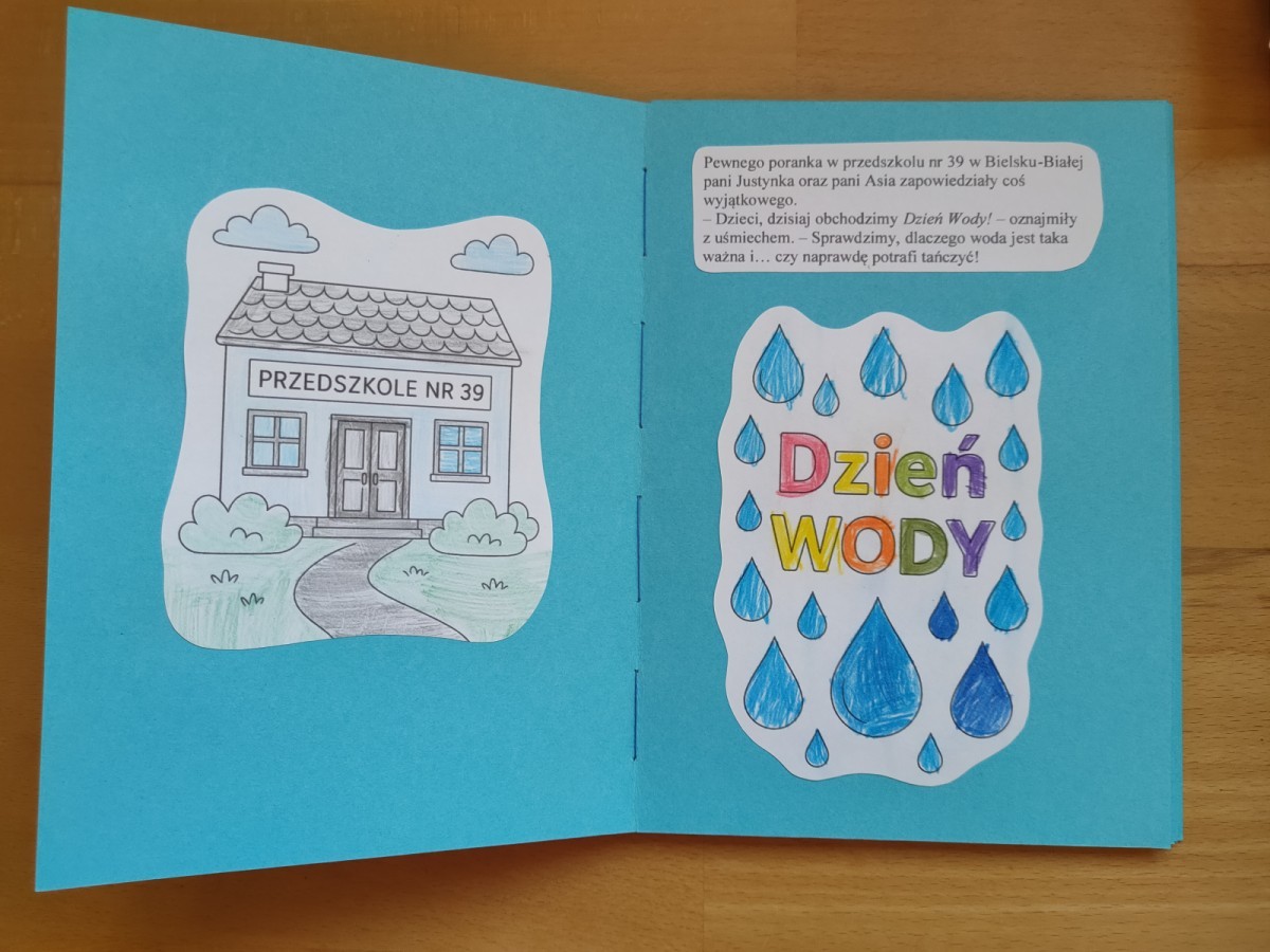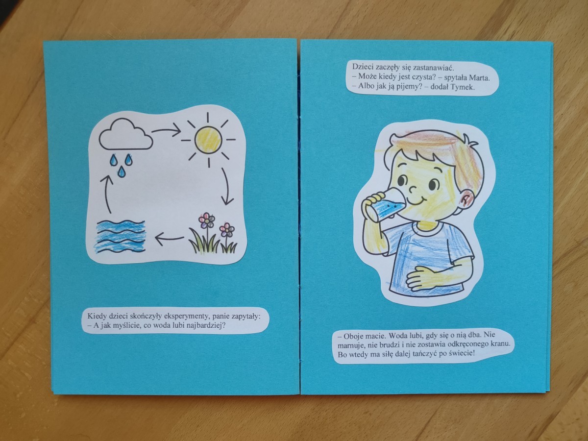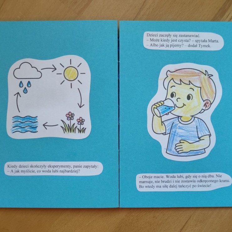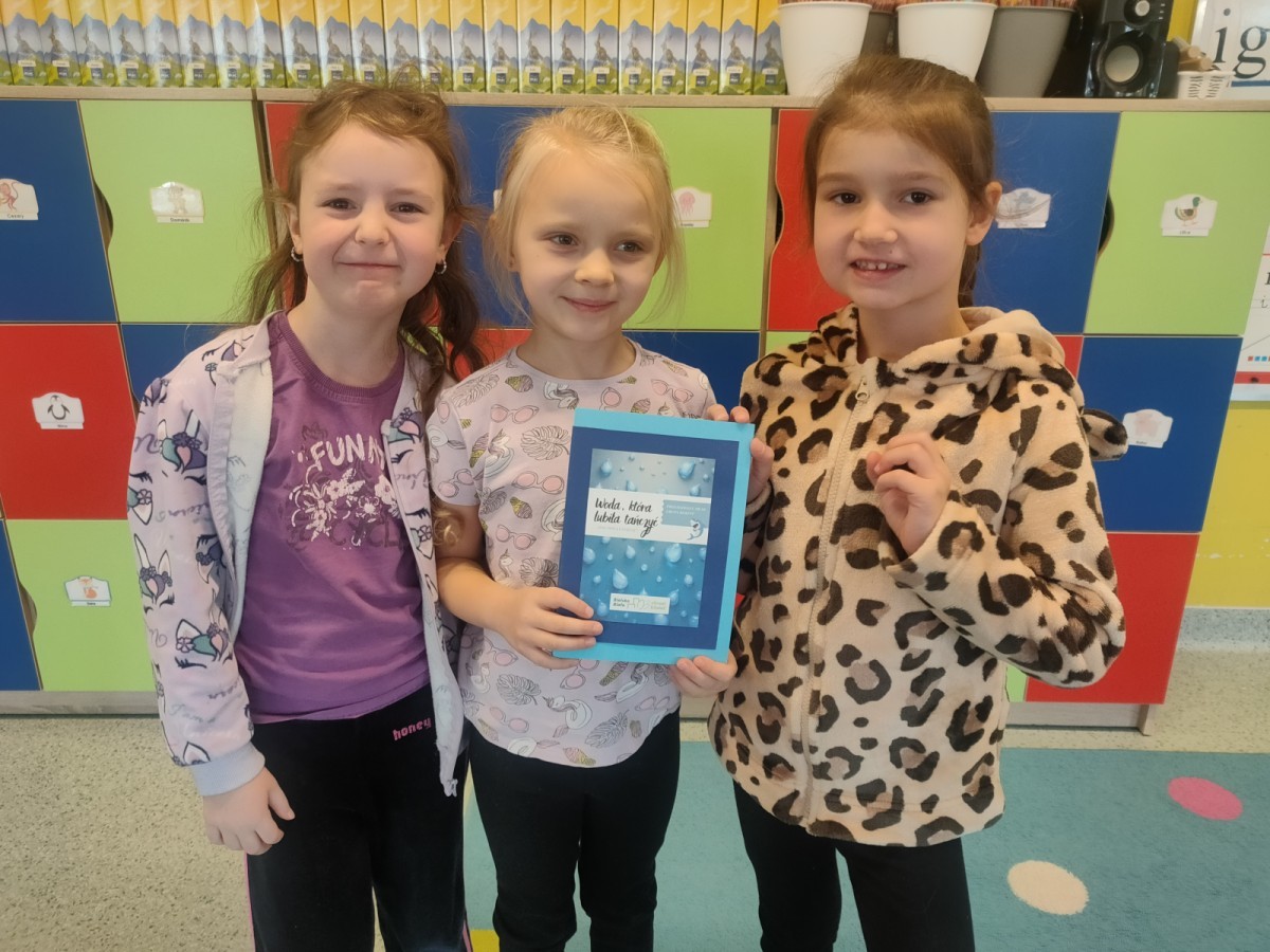 W ramach akcji „Szanuj energię – chroń klimat” nasza grupa Rekiny wyruszyła w wyjątkową podróż po świecie wody! Na początku wspólnie przeprowadziliśmy burzę mózgów, podczas której dzieci dzieliły się swoimi skojarzeniami z wodą – padały pomysły o deszczu, morzach, a nawet o kąpieli w wannie! Następnie zastanawialiśmy się, co powinno znaleźć się w naszej książce. Kolejnym krokiem było kolorowanie ilustracji, które stały się częścią naszego opowiadania. Zwieńczeniem pracy było złożenie wszystkiego w autorską książkę grupy Rekiny, której głównym tematem jest obieg wody w przyrodzie – czyli to, jak woda nieustannie tańczy i krąży wokół nas, zmieniając swoje formy. Dzięki temu projektowi dzieci nie tylko rozwijały wyobraźnię i współpracę w grupie, ale także dowiedziały się, dlaczego woda jest tak ważna i jak możemy o nią dbać.