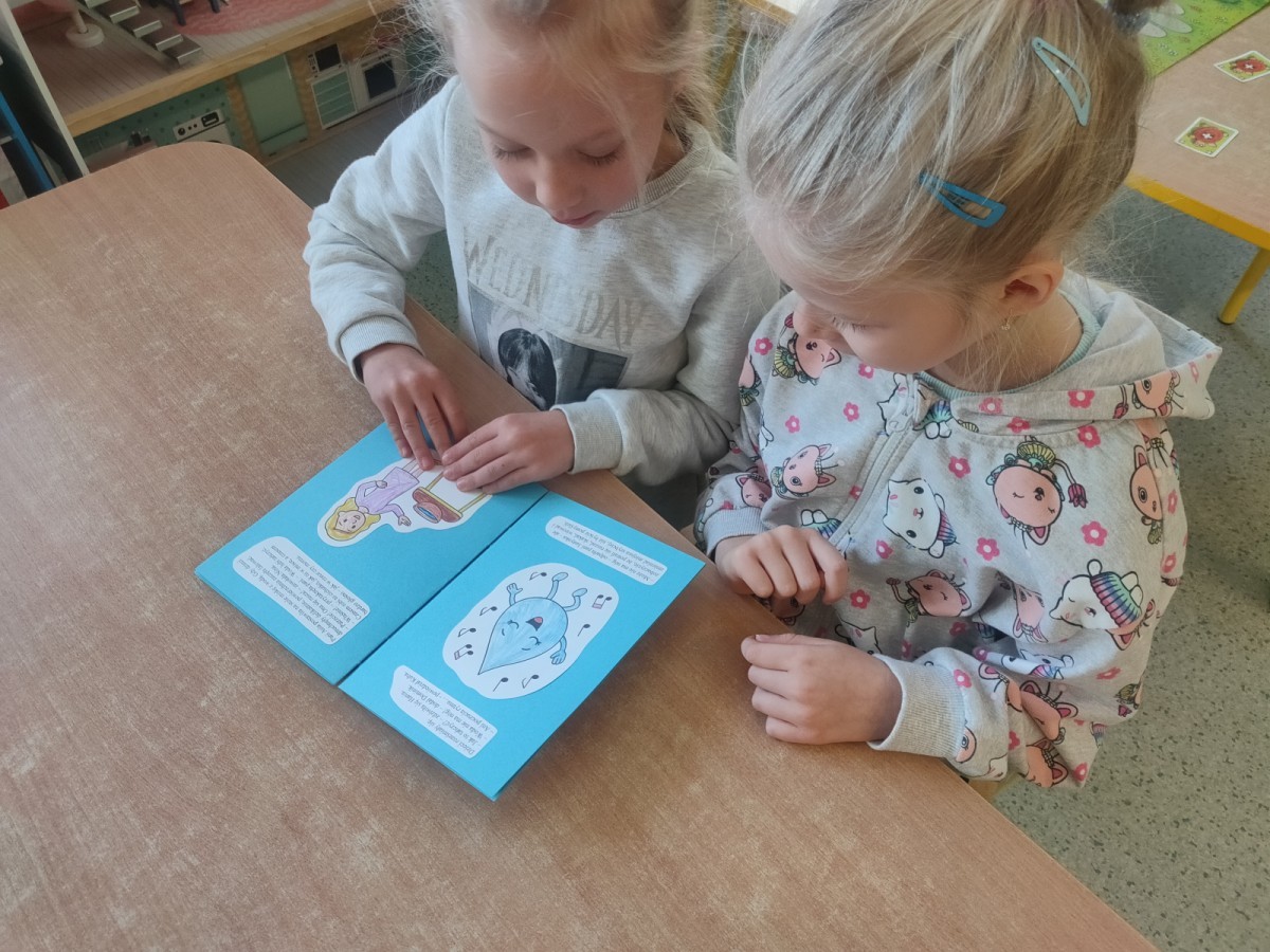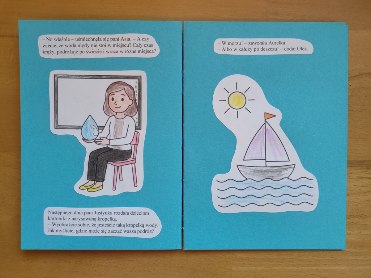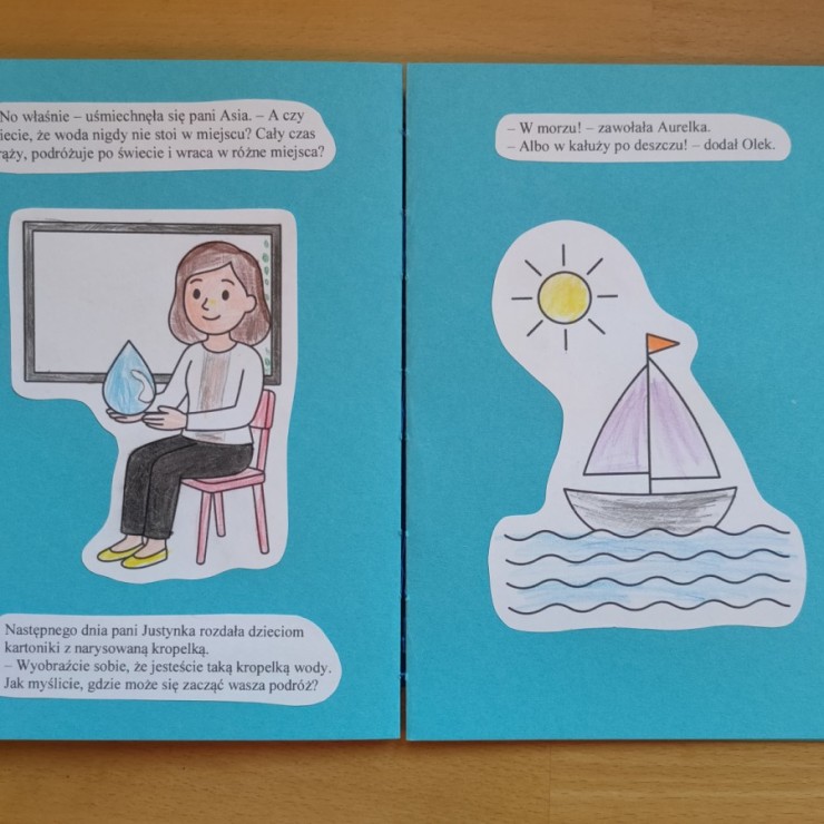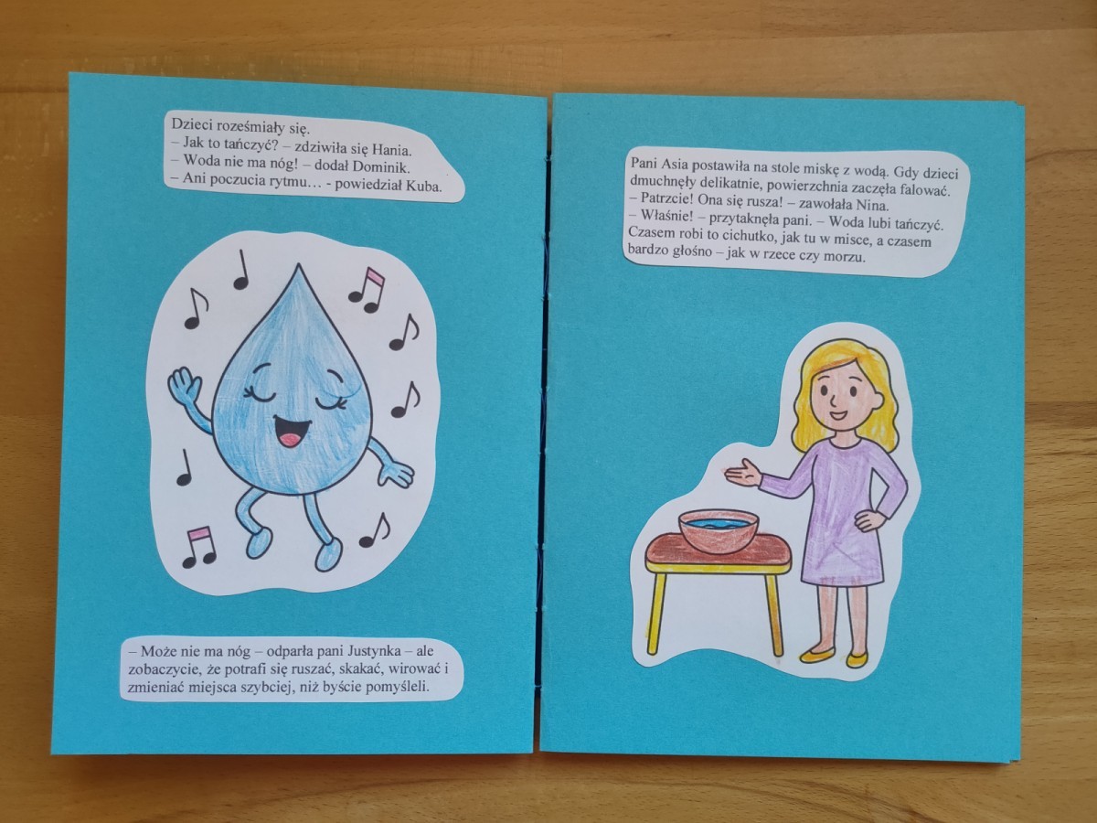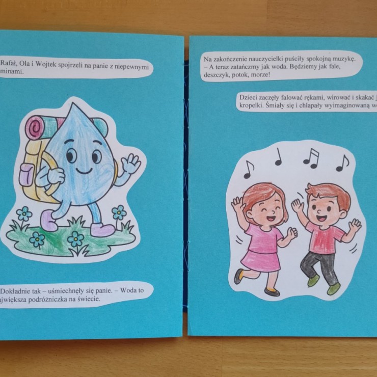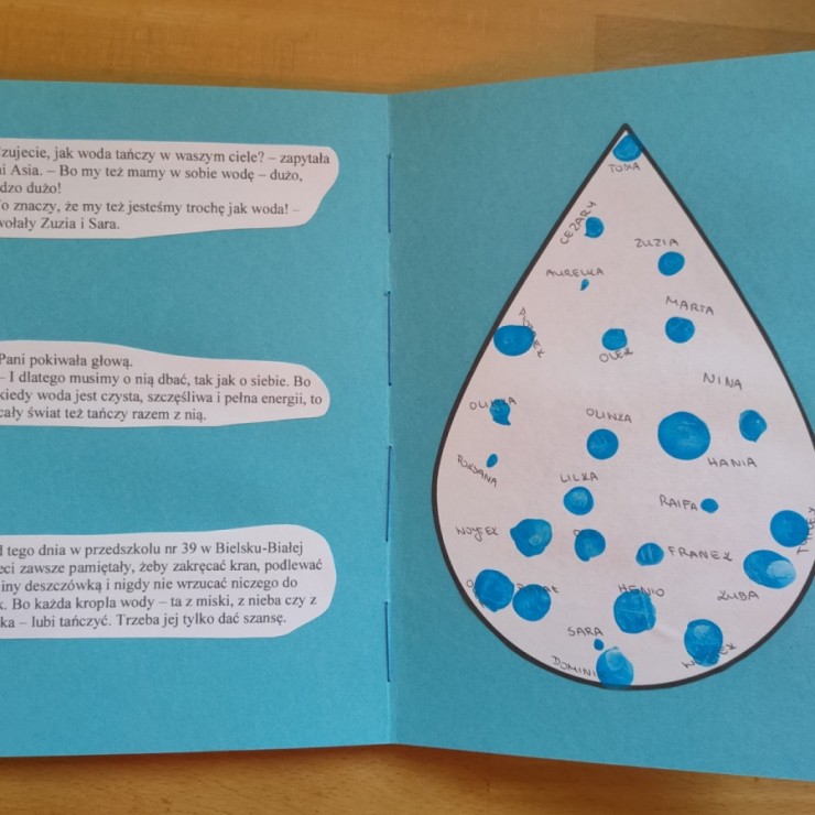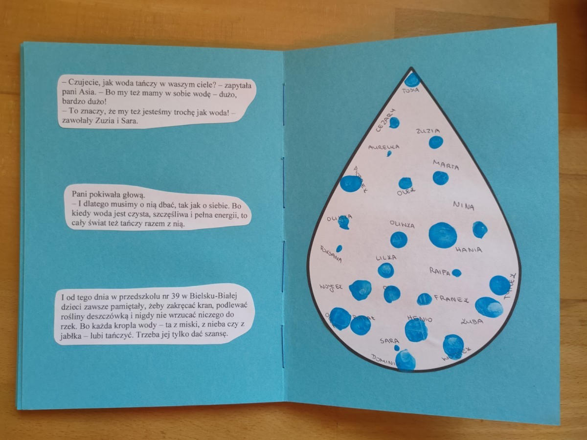 W ramach akcji „Szanuj energię – chroń klimat” nasza grupa Rekiny wyruszyła w wyjątkową podróż po świecie wody! Na początku wspólnie przeprowadziliśmy burzę mózgów, podczas której dzieci dzieliły się swoimi skojarzeniami z wodą – padały pomysły o deszczu, morzach, a nawet o kąpieli w wannie! Następnie zastanawialiśmy się, co powinno znaleźć się w naszej książce. Kolejnym krokiem było kolorowanie ilustracji, które stały się częścią naszego opowiadania. Zwieńczeniem pracy było złożenie wszystkiego w autorską książkę grupy Rekiny, której głównym tematem jest obieg wody w przyrodzie – czyli to, jak woda nieustannie tańczy i krąży wokół nas, zmieniając swoje formy. Dzięki temu projektowi dzieci nie tylko rozwijały wyobraźnię i współpracę w grupie, ale także dowiedziały się, dlaczego woda jest tak ważna i jak możemy o nią dbać.
