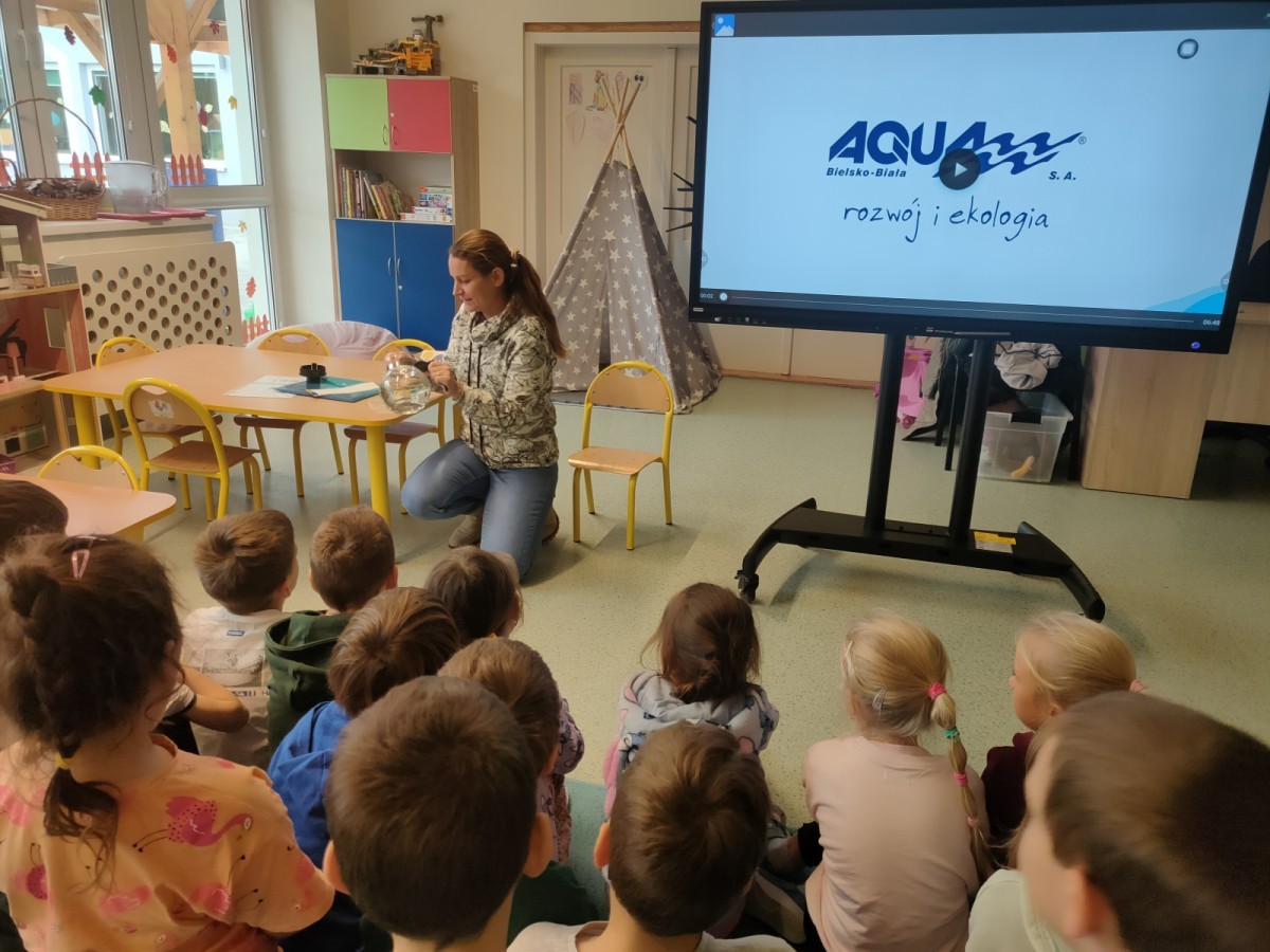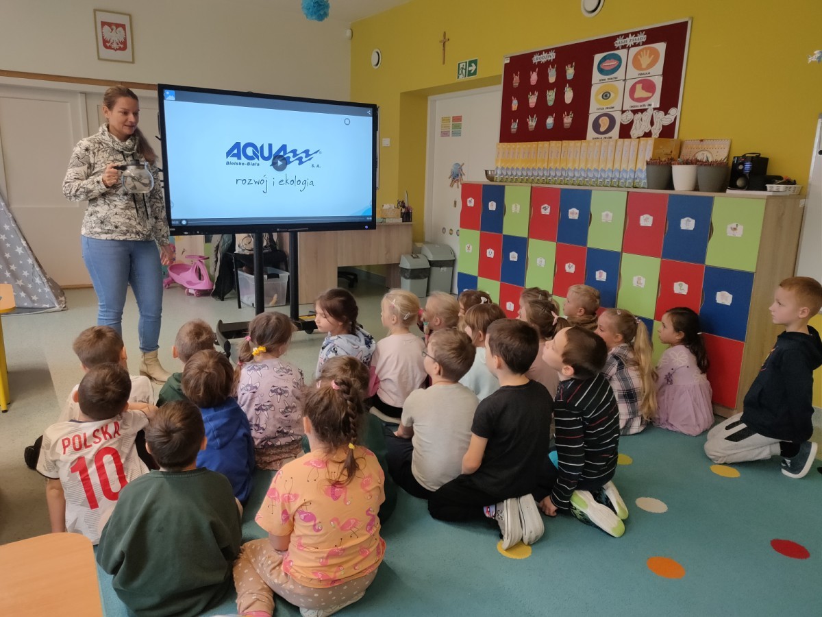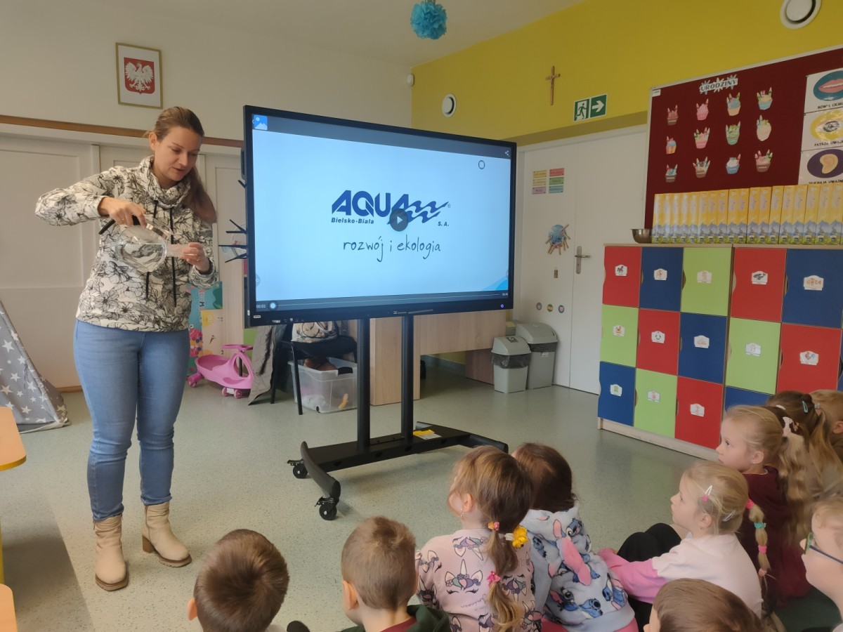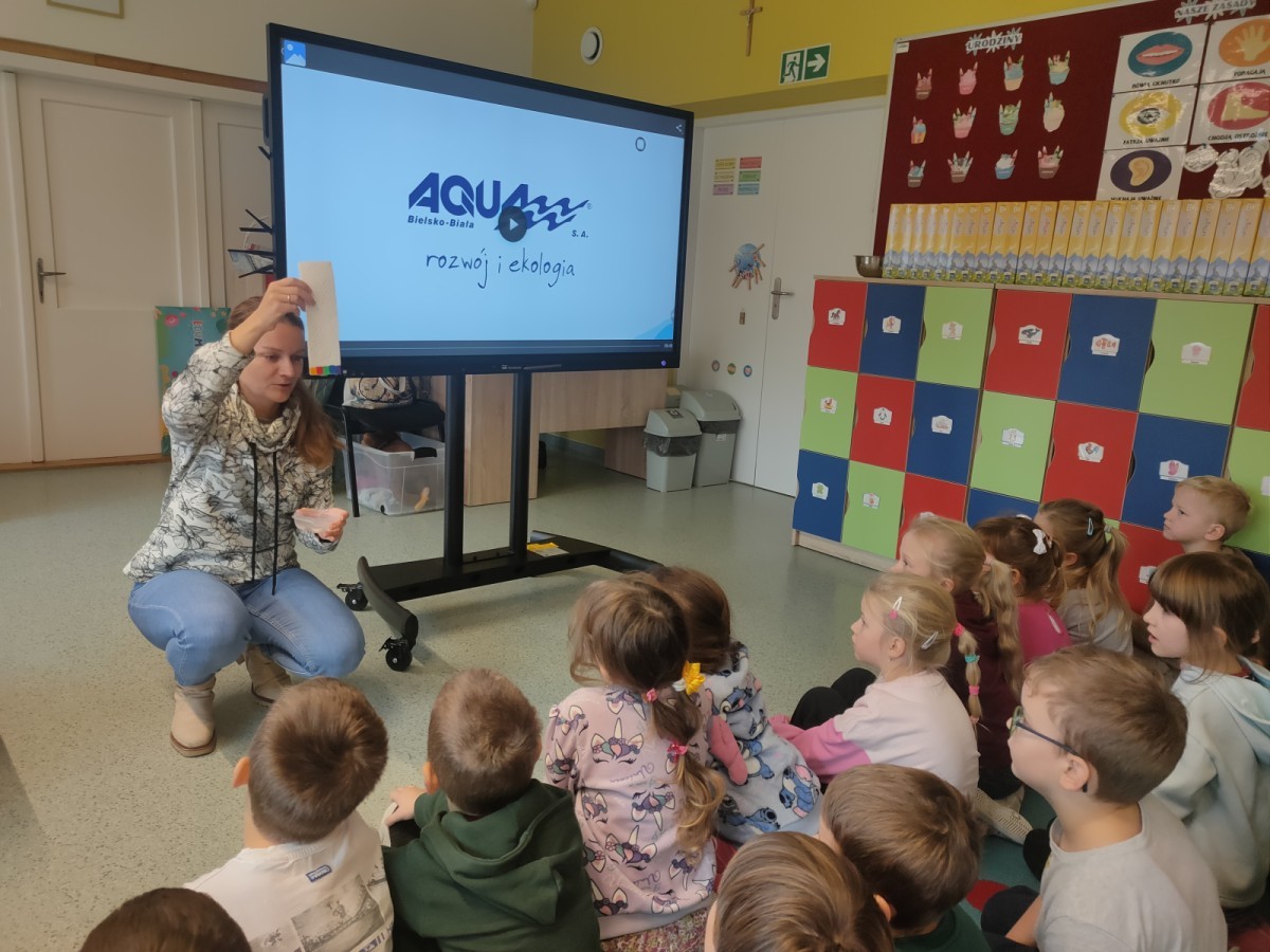 W naszym przedszkolu odbyły się zajęcia edukacyjne prowadzone przez przedstawicielkę firmy Aqua S.A. z Bielska-Białej. Podczas warsztatów dzieci dowiedziały się, jak wygląda gospodarowanie wodą w naszym mieście, ile wody znajduje się w człowieku, a także jaka część zasobów wodnych na Ziemi to woda słodka, a jaka słona. Przedszkolaki obejrzały również film edukacyjny oraz otrzymały książeczki z przygodami Detektywa Kropelki. Spotkanie było pełne ciekawostek i inspiracji do dbania o wodę - jeden z najcenniejszych skarbów naszej planety.