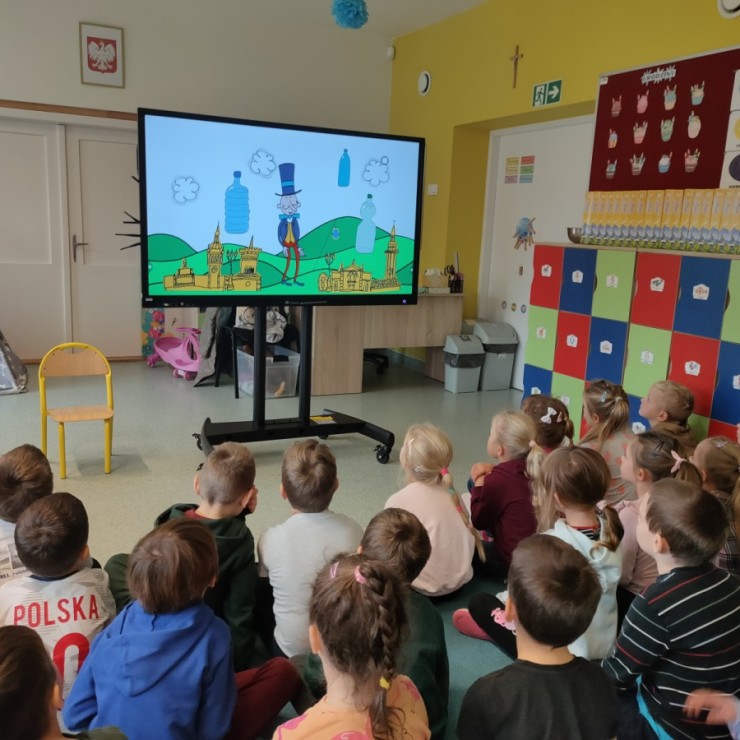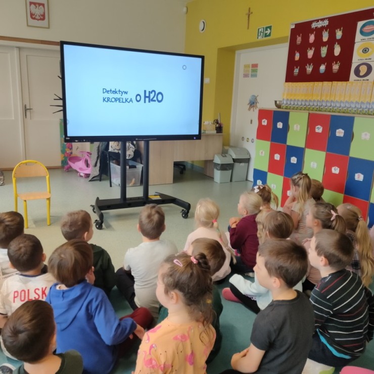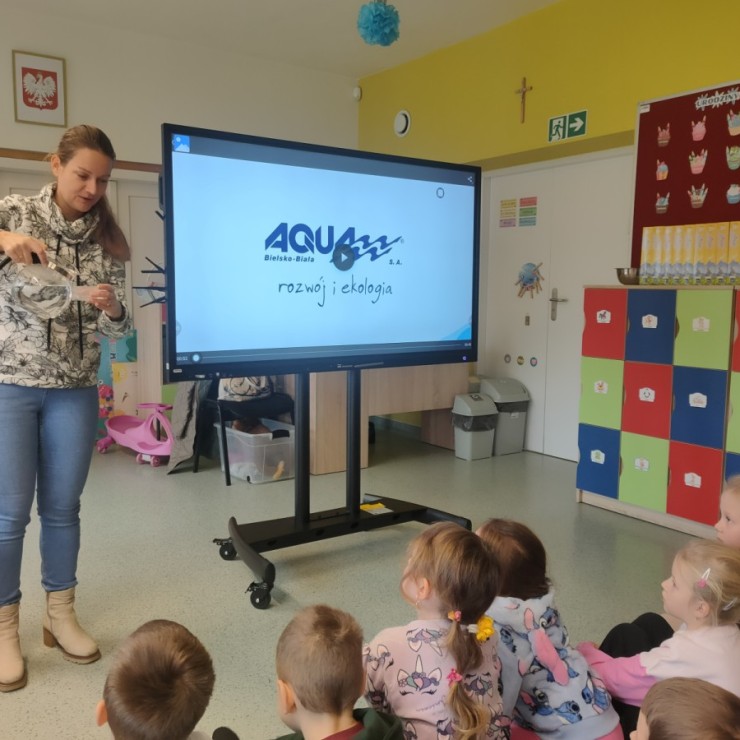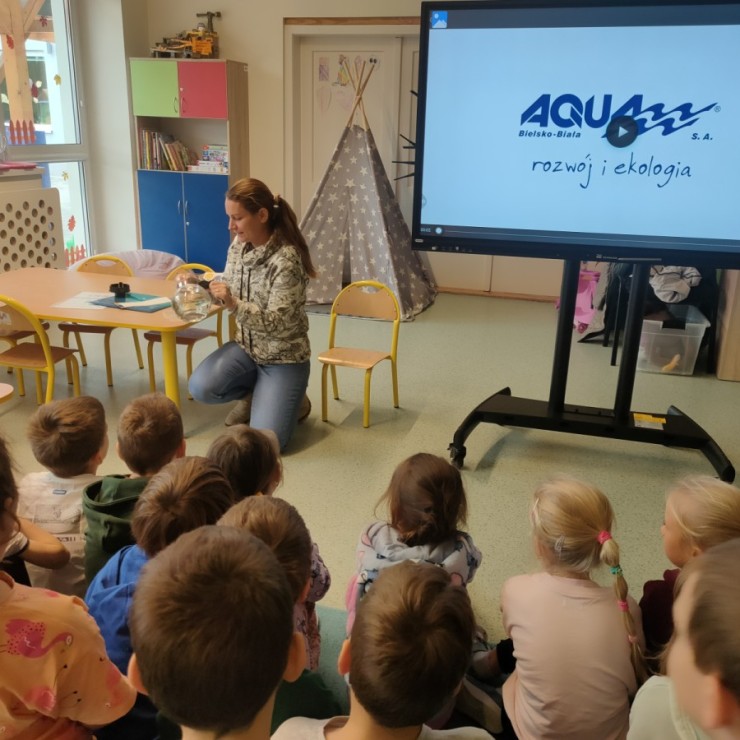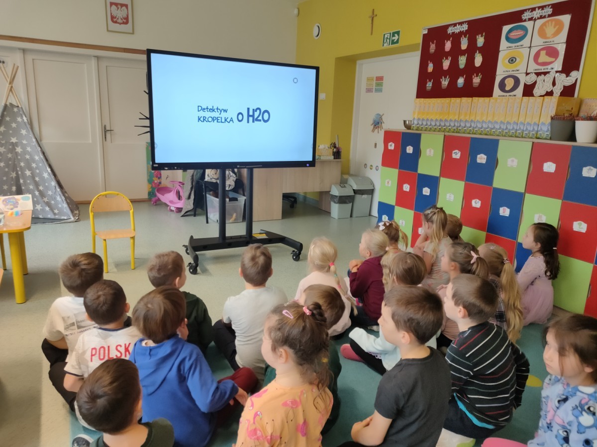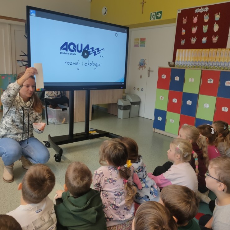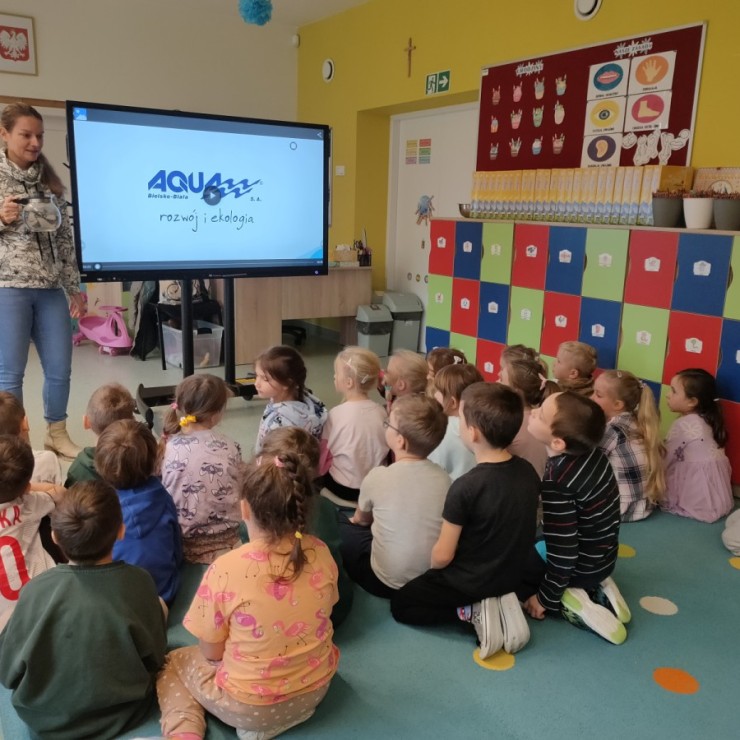 W naszym przedszkolu odbyły się zajęcia edukacyjne prowadzone przez przedstawicielkę firmy Aqua S.A. z Bielska-Białej. Podczas warsztatów dzieci dowiedziały się, jak wygląda gospodarowanie wodą w naszym mieście, ile wody znajduje się w człowieku, a także jaka część zasobów wodnych na Ziemi to woda słodka, a jaka słona. Przedszkolaki obejrzały również film edukacyjny oraz otrzymały książeczki z przygodami Detektywa Kropelki. Spotkanie było pełne ciekawostek i inspiracji do dbania o wodę - jeden z najcenniejszych skarbów naszej planety.